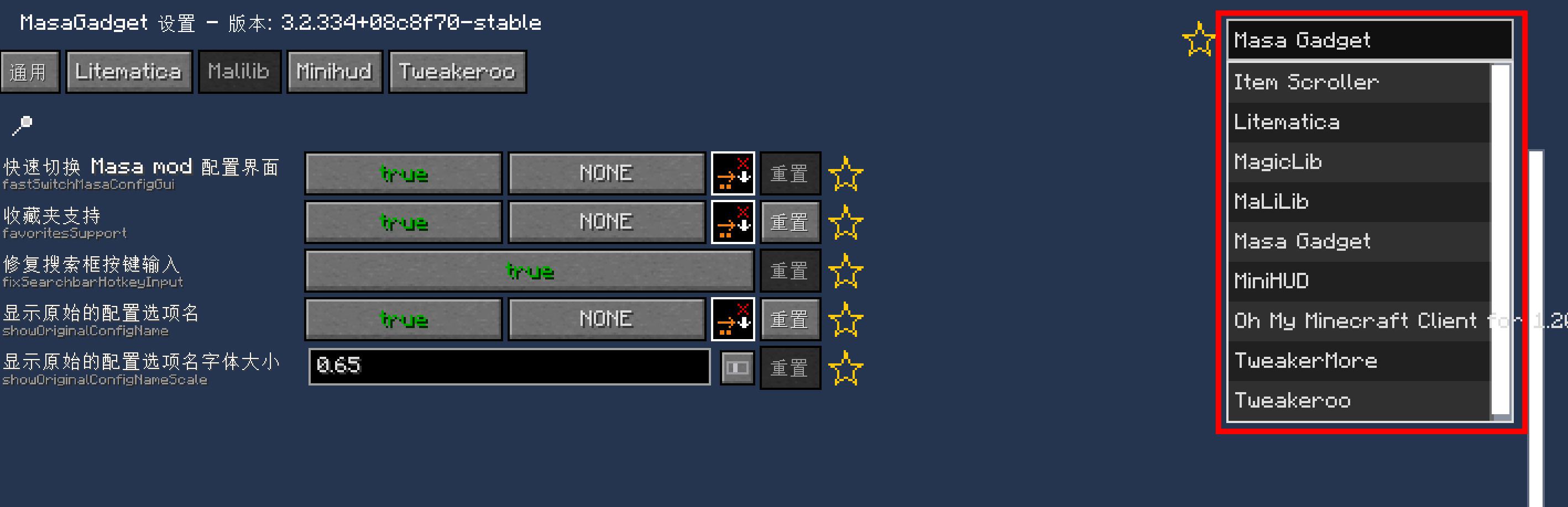 安装Masa Gadget后默认开启,在任何一个masamod配置界面的右上角可以快速切换到其他的masamod配置界面中