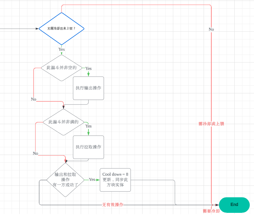 当漏斗确定自己需要做些什么时,它会先尝试向指向的容器输出。随后,它会尝试从上方吸取物品。最后,如果吸取和输出中有任意一方成功了,它就会设置冷却,并更新同步自己的数据。
